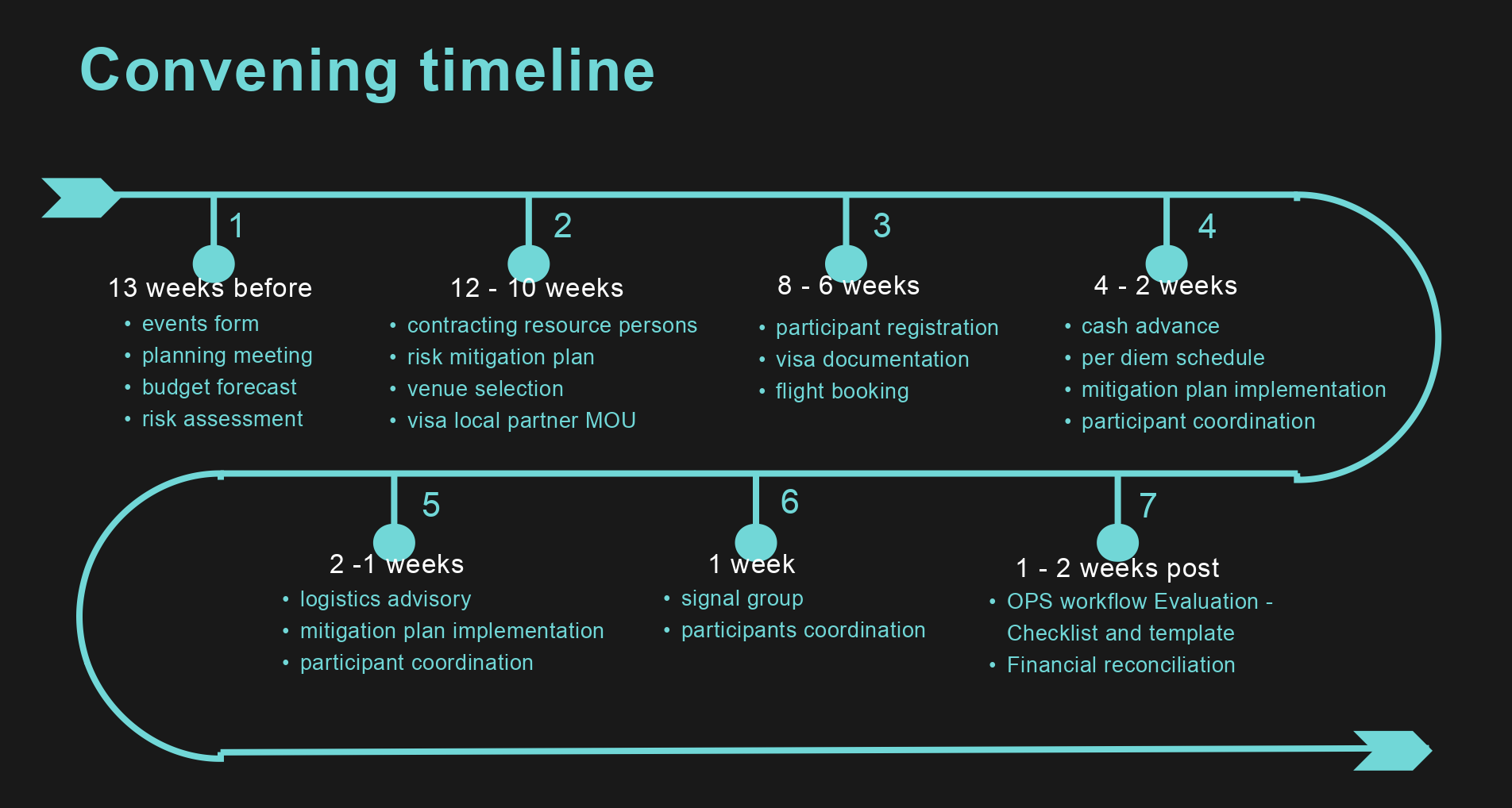 The convening point of contact shall begin the planning as soon a convening idea is formalised and proceed by submitting the convening form to record all important details about the event.