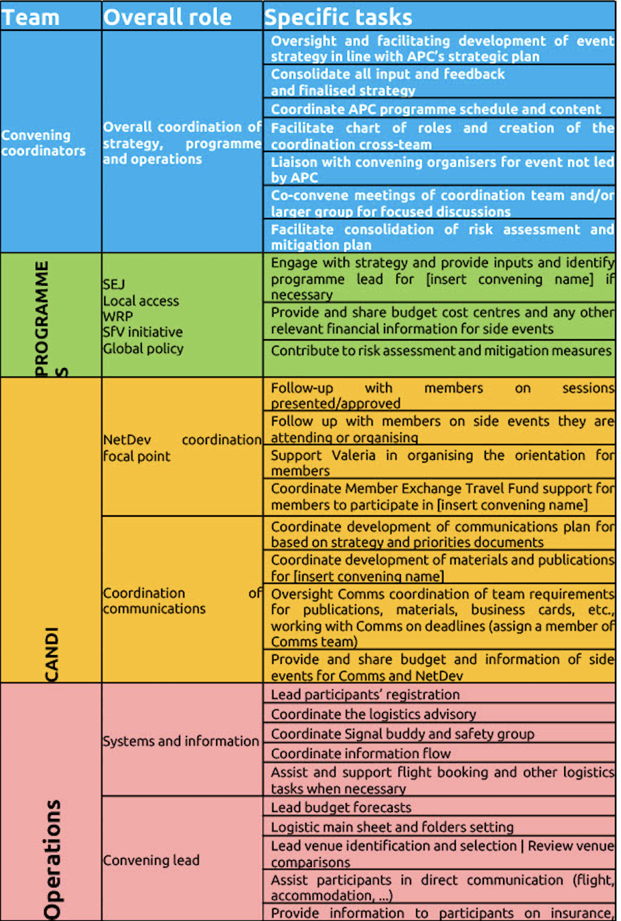 APC has developed a standard chart of roles template that can be adapted and adjusted according to the specificity of the convening. Once this chart is completed, the Ops core team will add everyone to the event form ticket providing additional space beside the MM convening channel, for direct communication and coordination that can be managed either through Redmine or directly through Thunderbird email client.