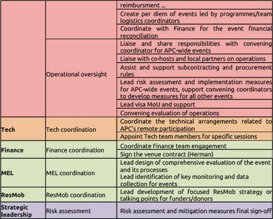 The chart of roles contains two templates, one for planning and the other implementation of the programme schedule and other related tasks. The following table shows all APC teams that can contribute to the planning of the convening and general tasks. The convening point of contact can add or strike out the team involved or the task, adapting them to the nature and the size of the event they are coordinating.